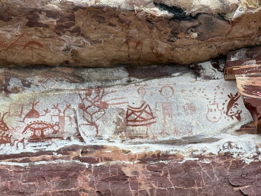 Monumental rock paintings wrapped around the tepuy’s steep cliffs, depictions of shamans, ceremony, animals and agriculture — some dating back 15,000 years. This tepuy is a sacred site believed to house their ancestors, for centuries communities would journey to the cliffs to worship them and collect macaw feathers for ceremonial dances, still used today. The astonishing preservation of such a long-standing tradition seems at odds with the little literature that exists about the tepuy and its rock paintings- Colombia is still discovering its indigenous art legacy.